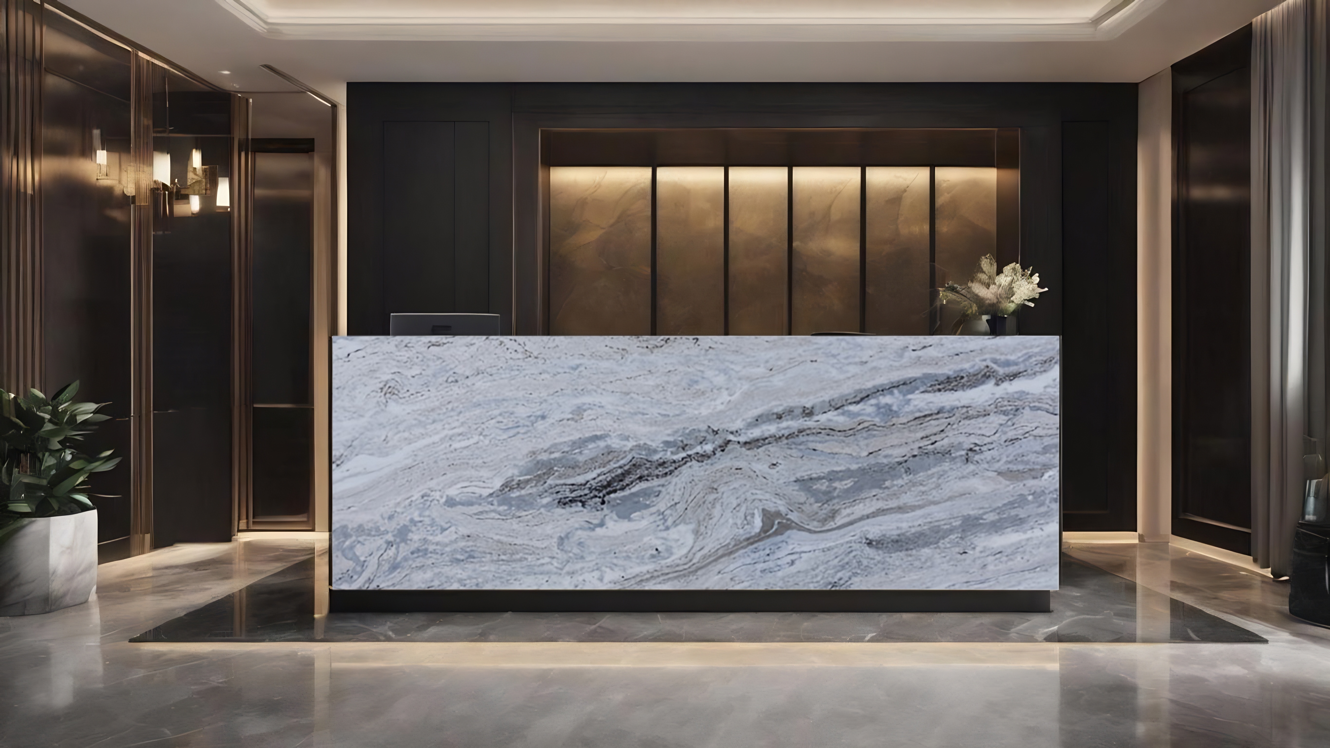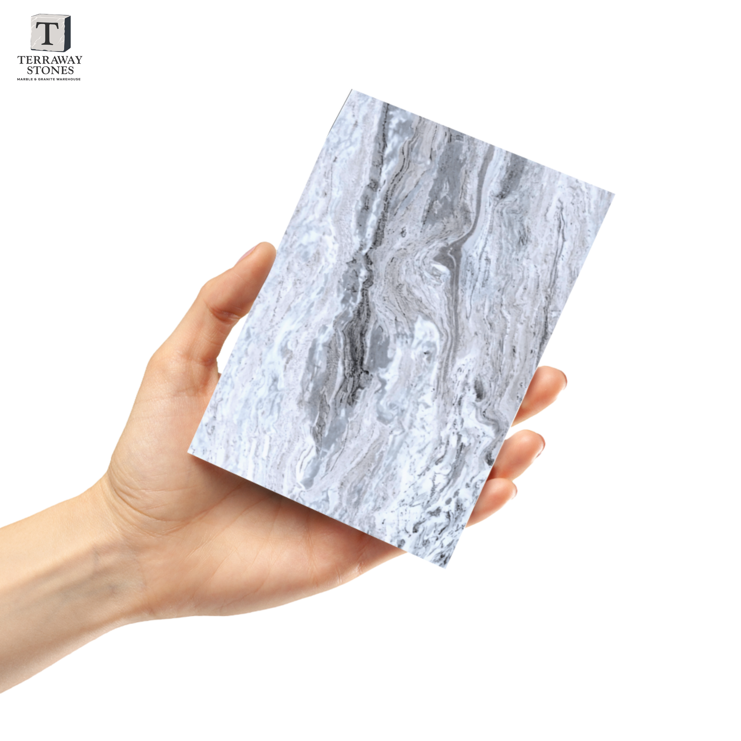 As part of the Terraway Signature Range, Sapphire Drift brings calm luxury through its flowing veining in misty greys, silvery whites, and soft blues. Inspired by water in motion, it’s ideal for refined spaces seeking subtle elegance and natural beauty.